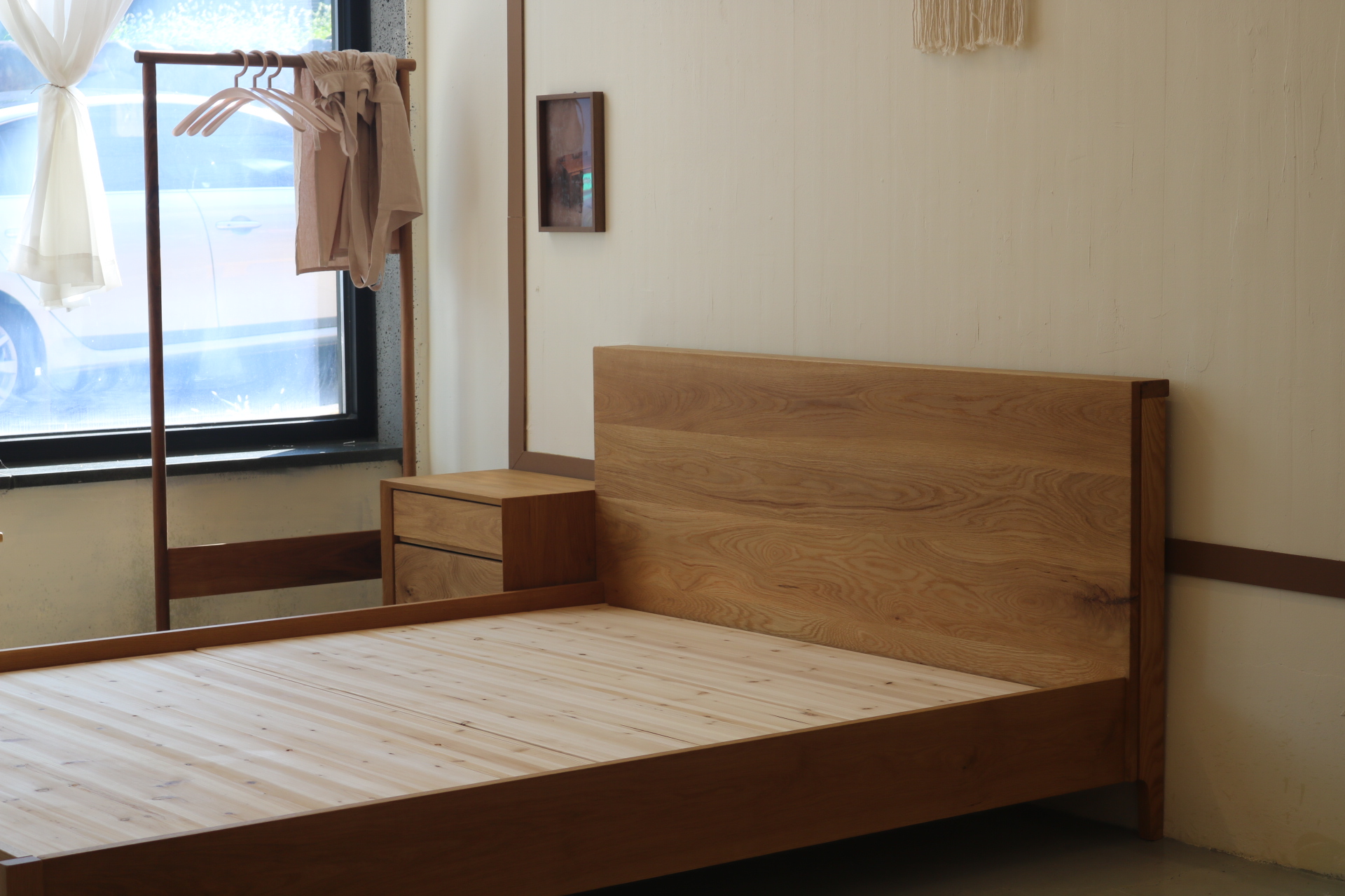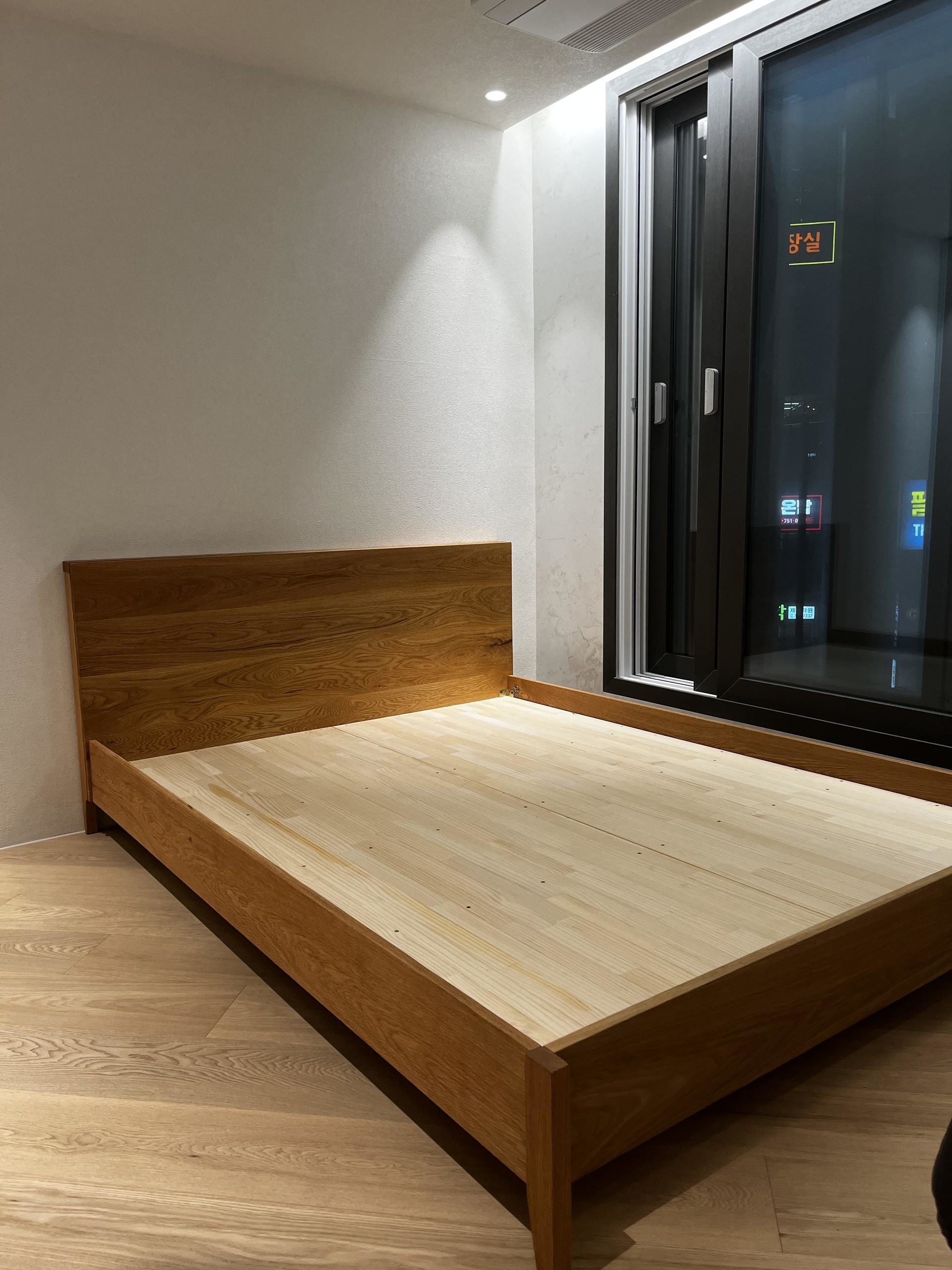이번에도 역시 화이트오크 제작된 통판형 침대 입니다. 대구 경산에서 파주 멀리 갔다 왔어요 : ) 레드오크로 제작된 통판형 프레임입니다. 사전 상담에 너무 붉지 않을까 걱정하