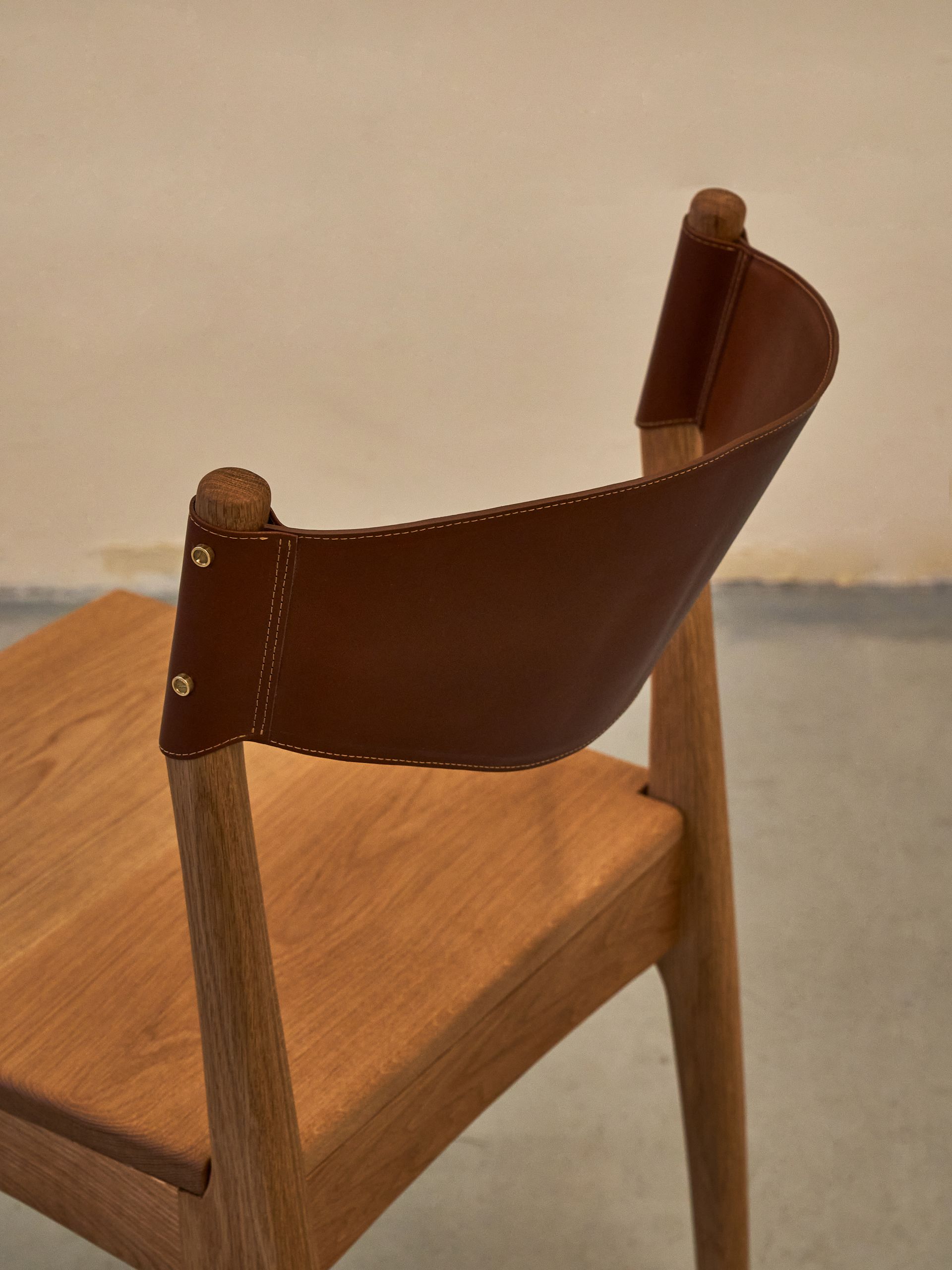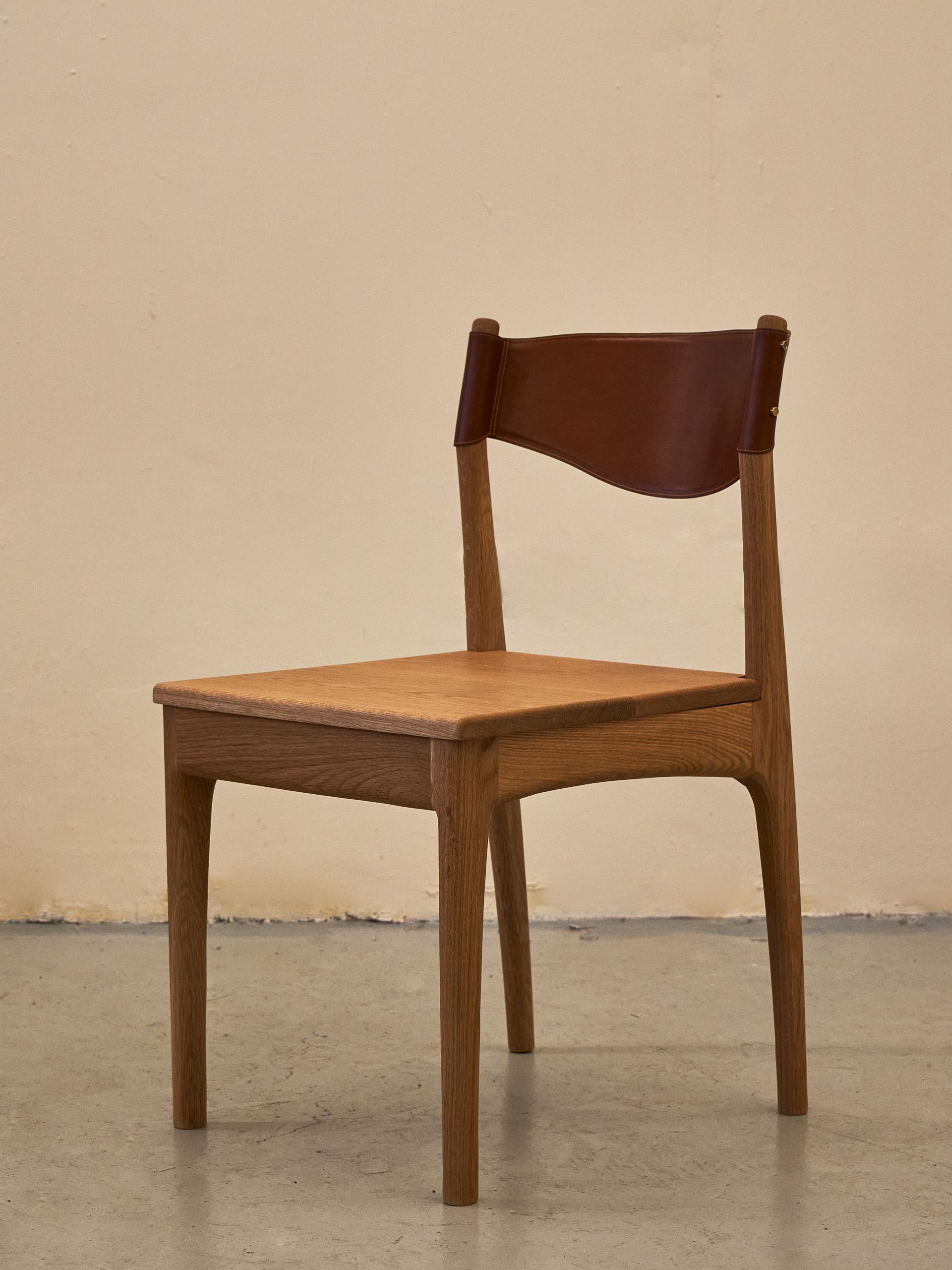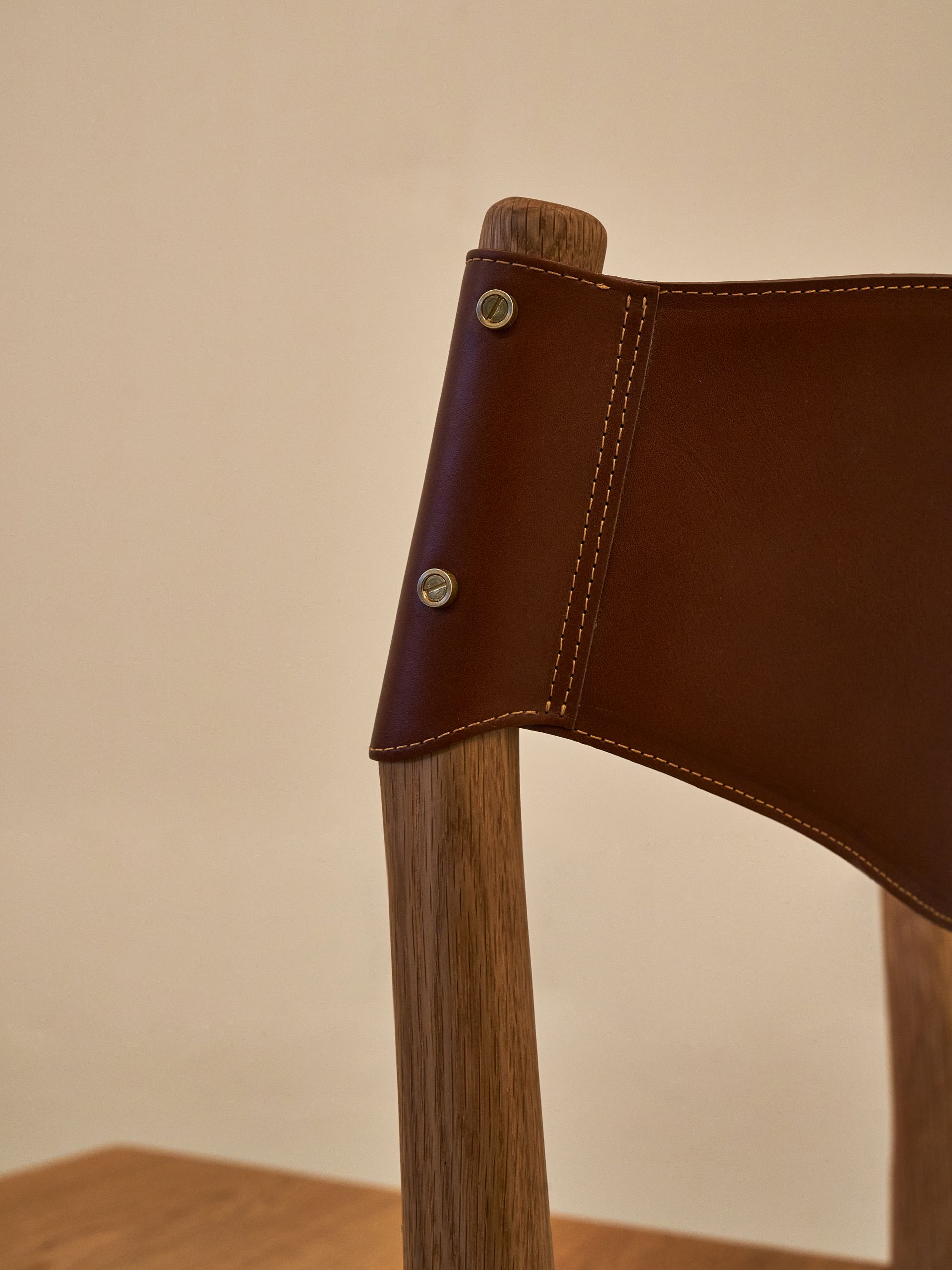 백참나무의 소재로 제작된 화이트 오크 가죽형 등받이 의자입니다.