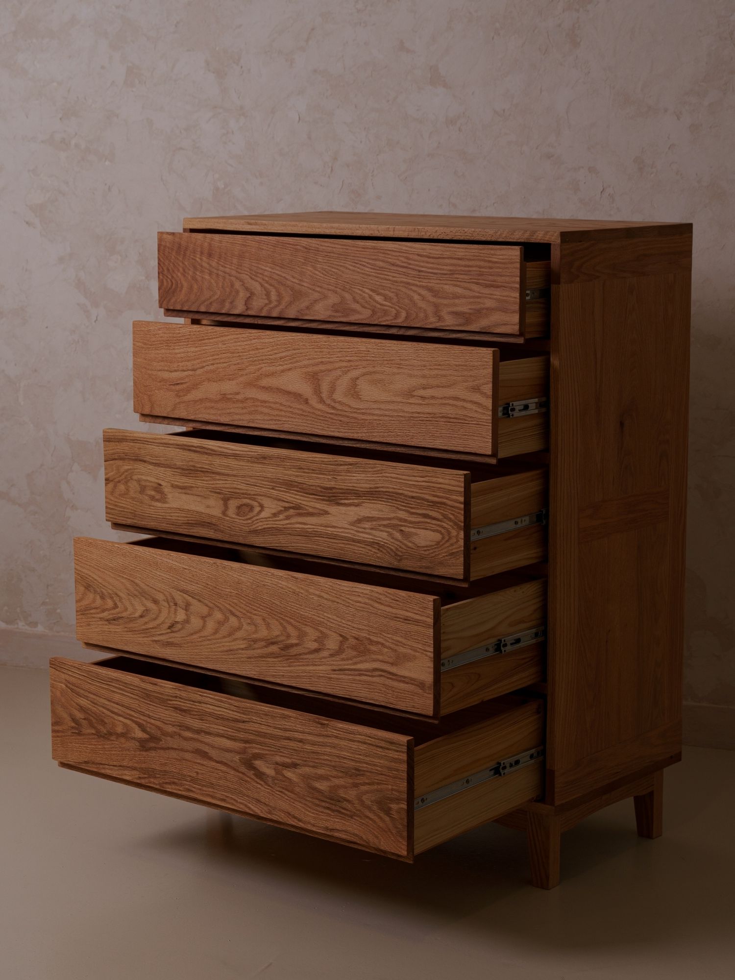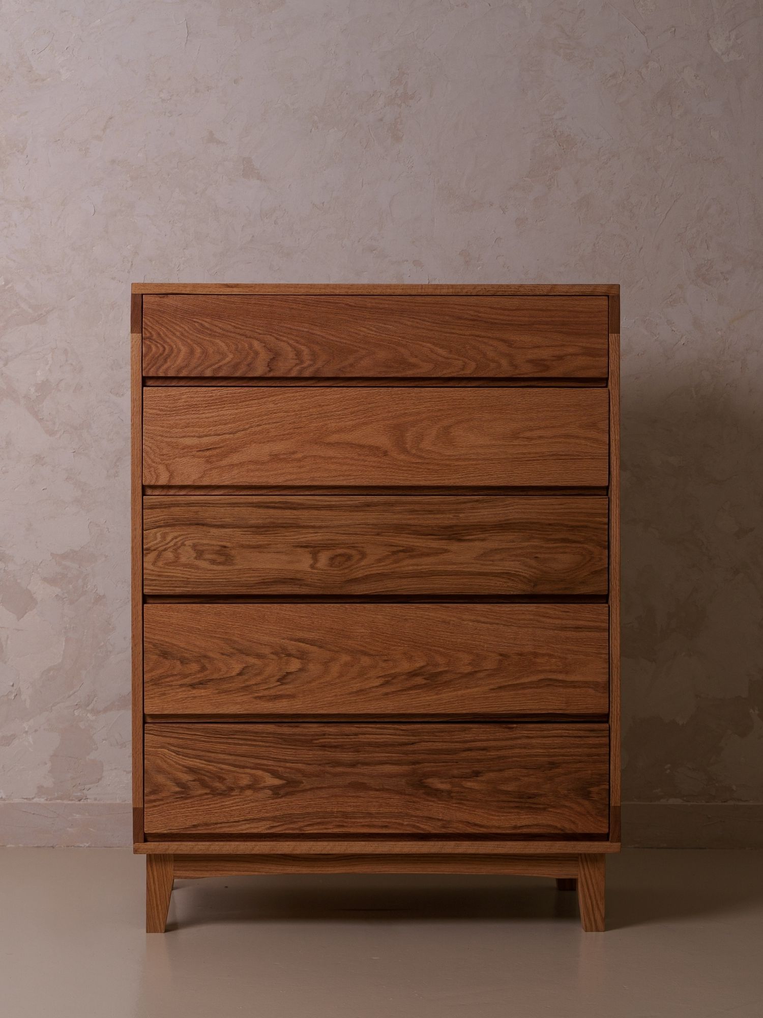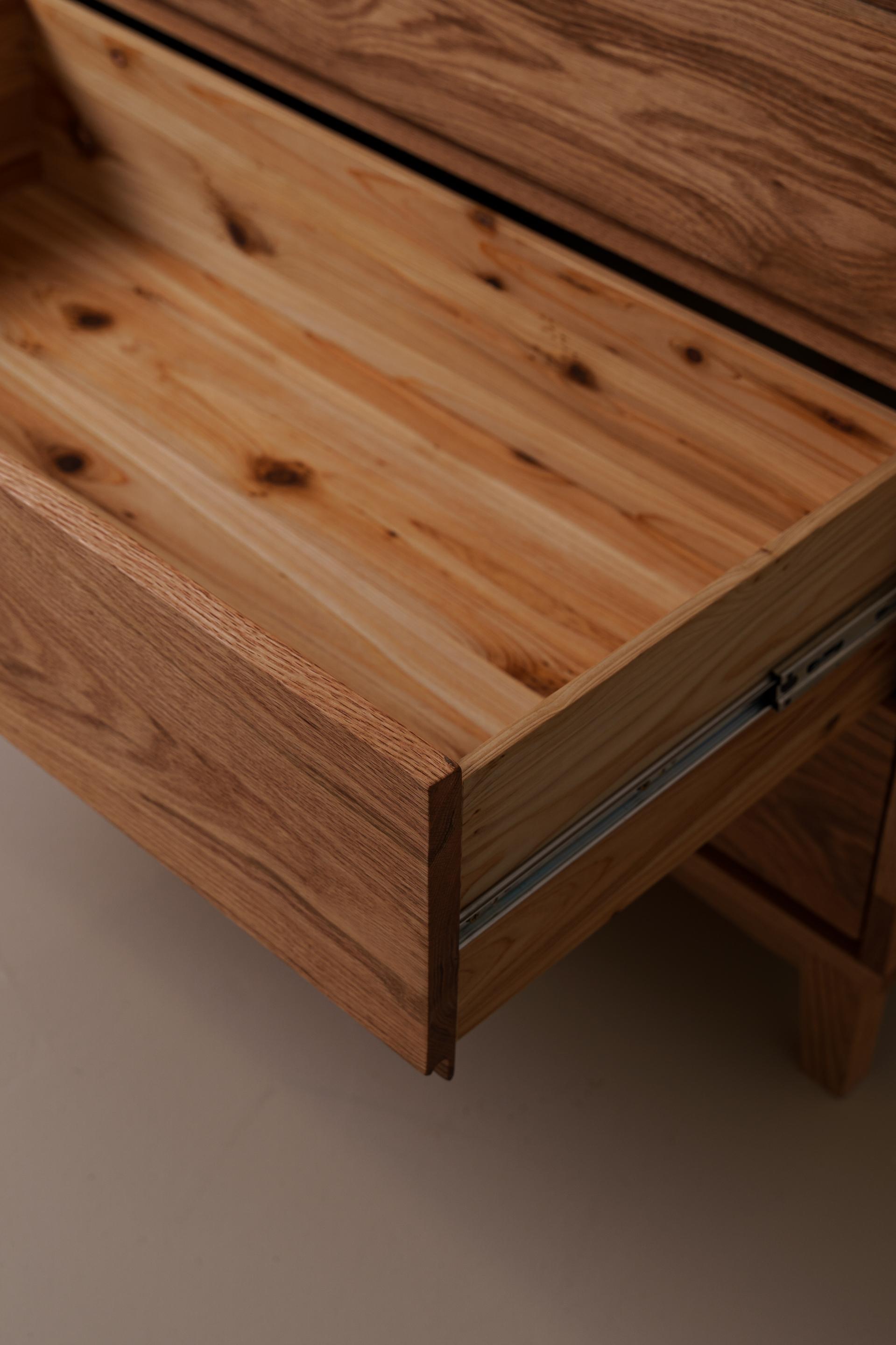 세심하게 나뭇결의 매력을 끌어올린 5단 서랍장입니다. 원목 그대로의