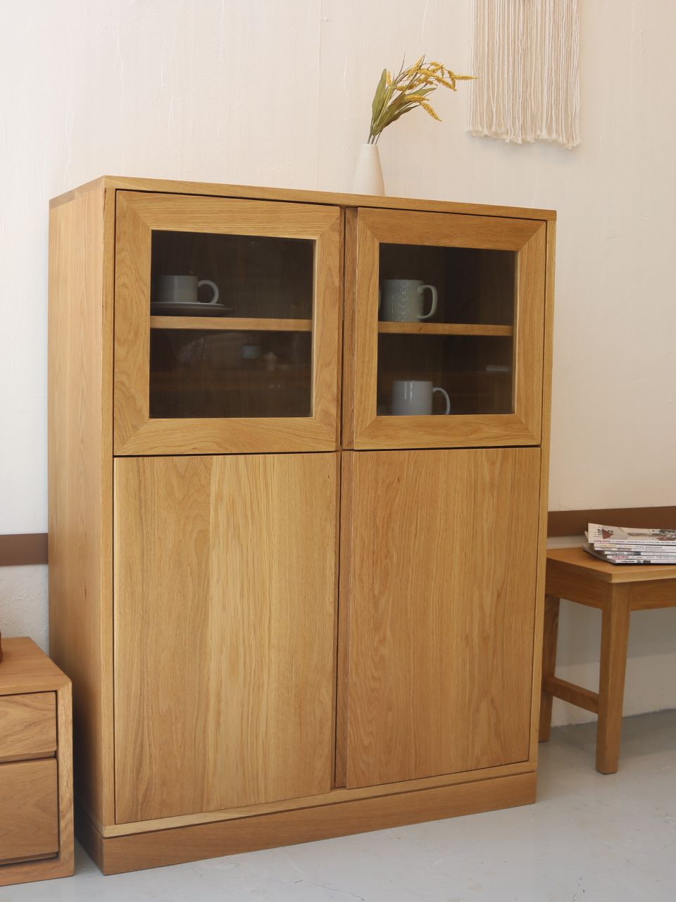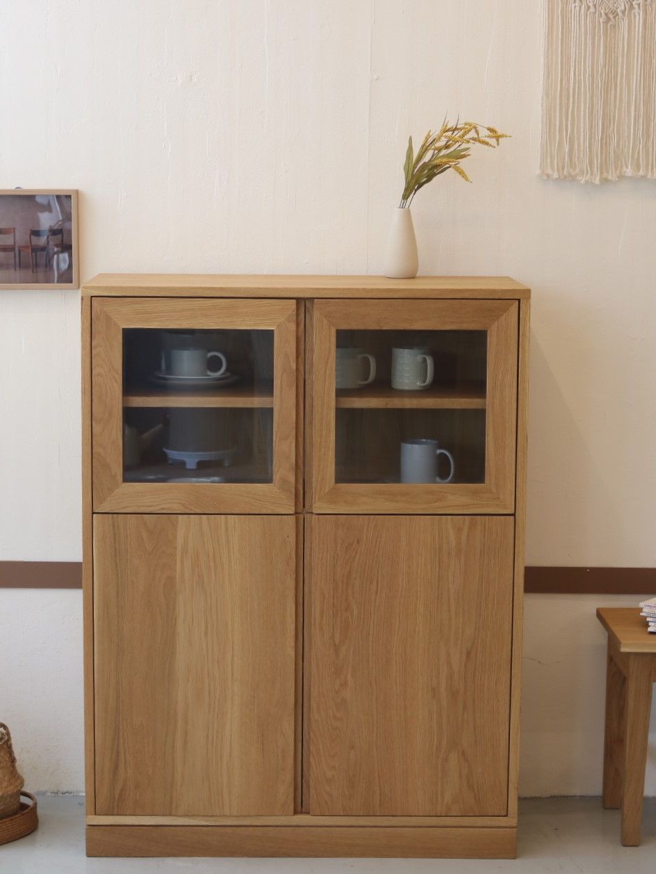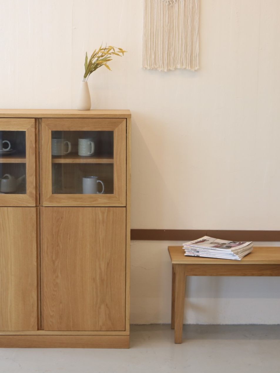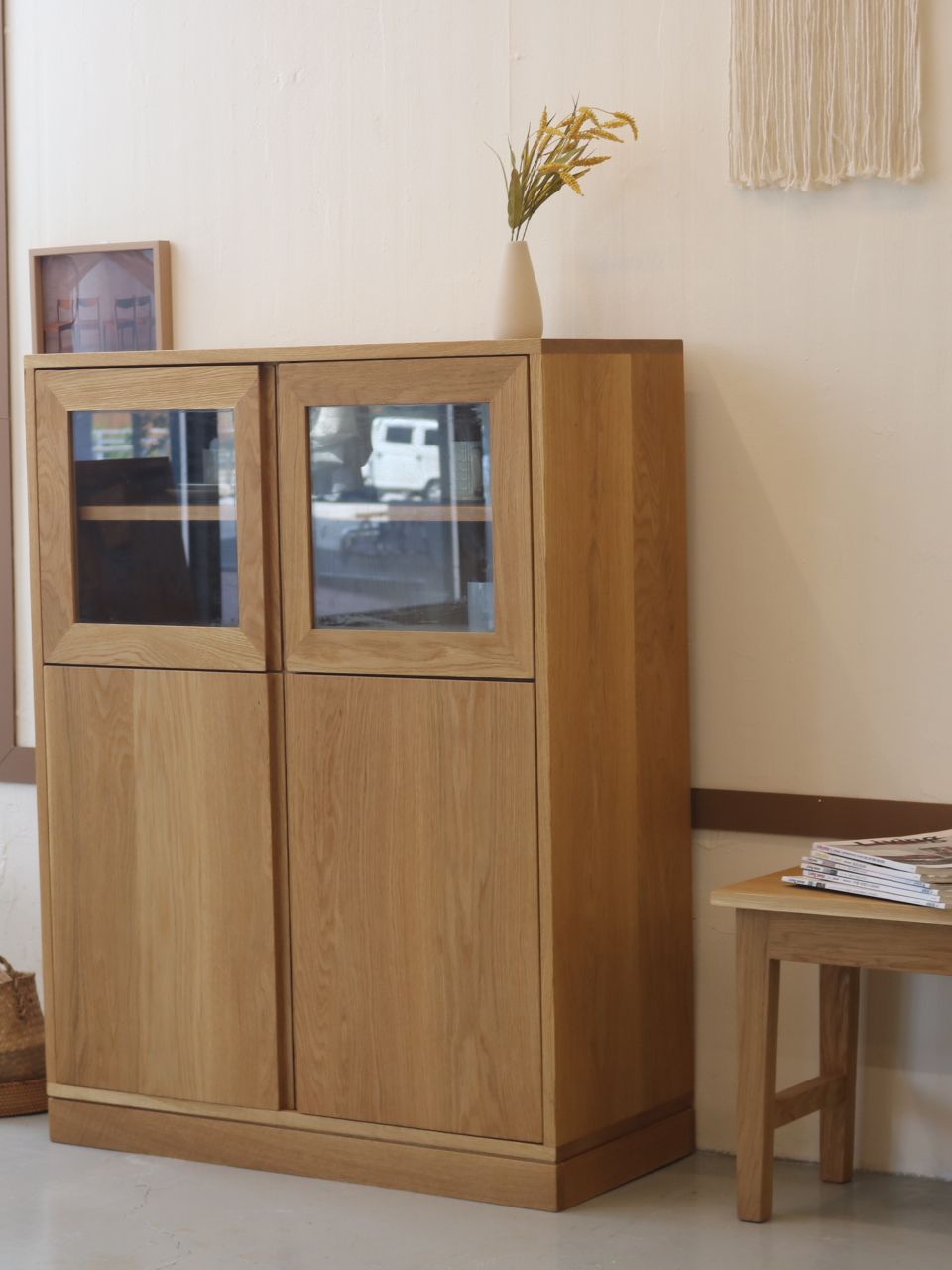 하부 양문형으로 제작된 여닫이 문 안에는 탈부착이 가능한 선반이 있습니다.