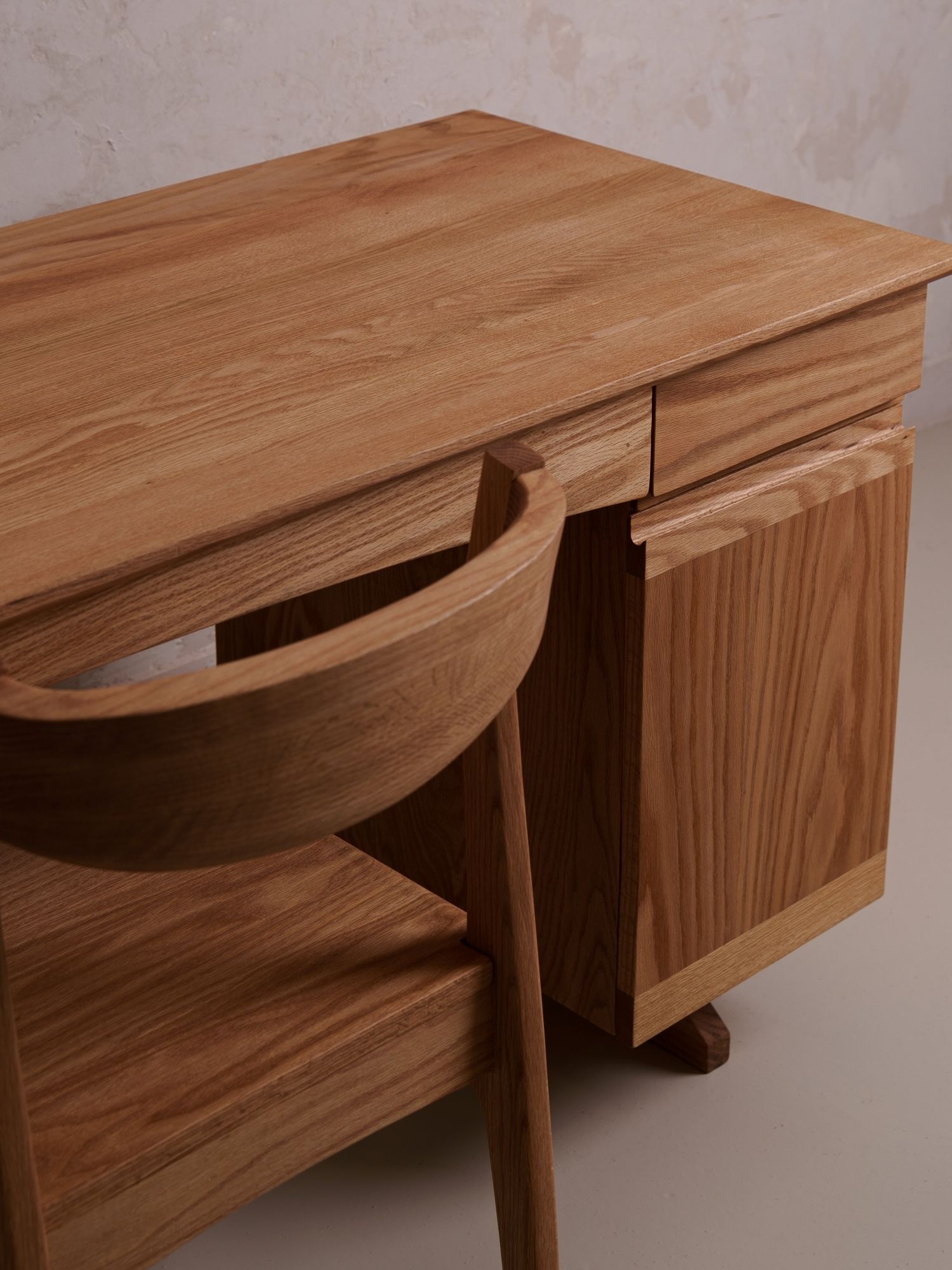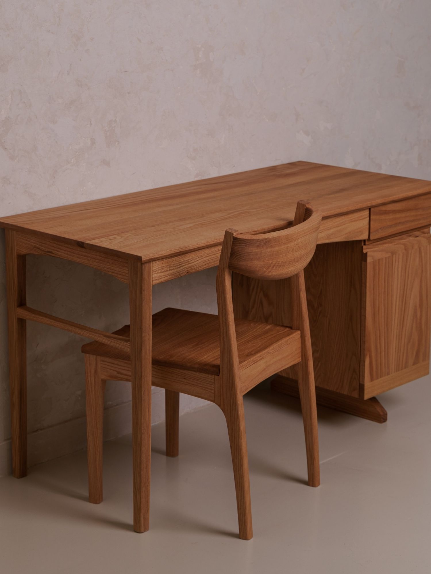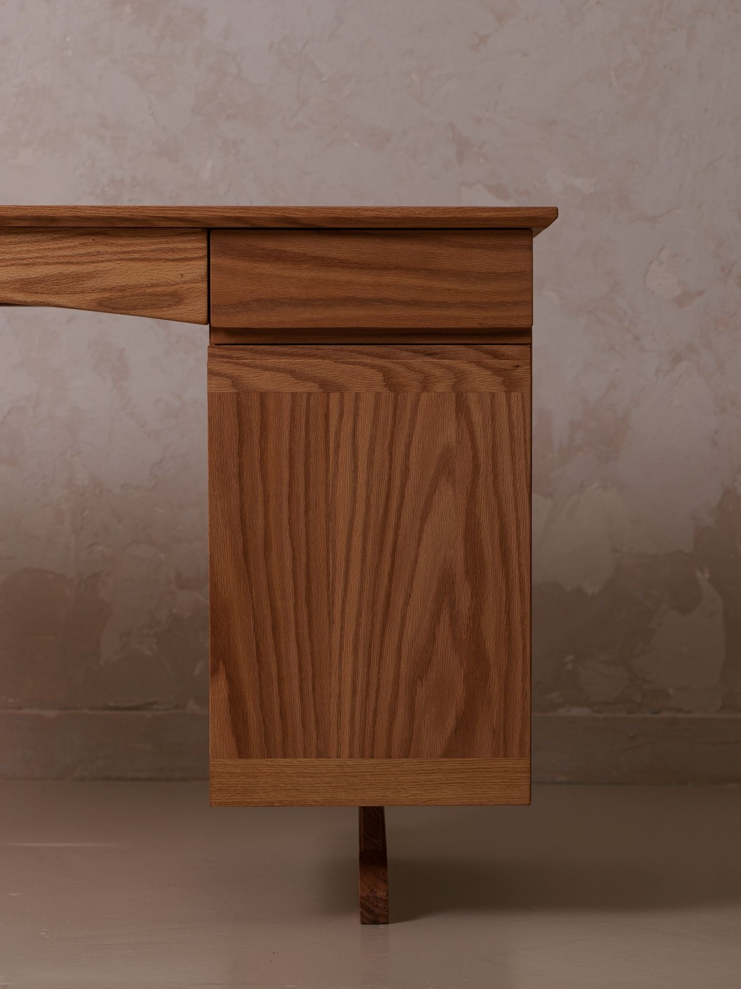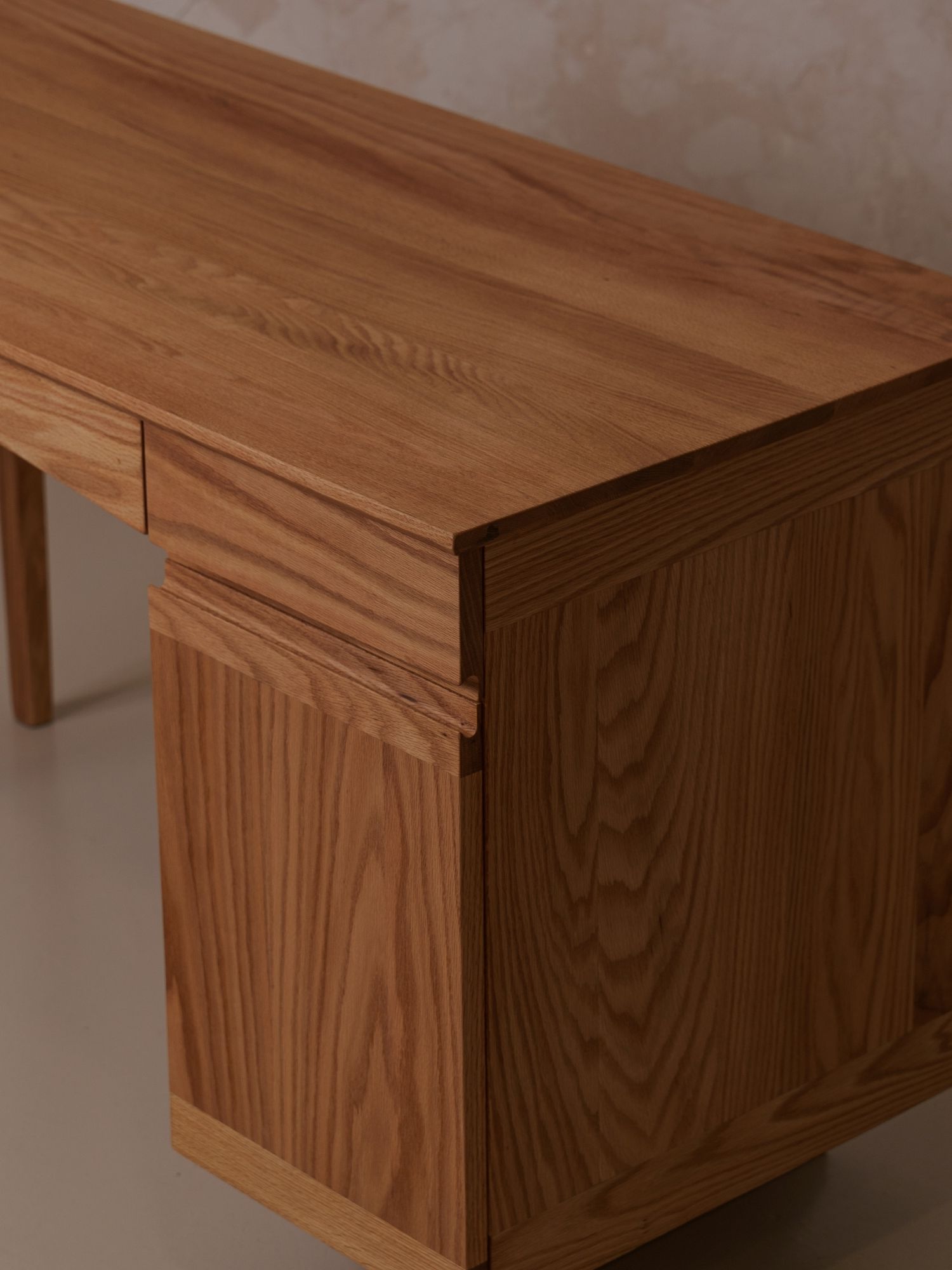 튼튼한 하부 구조의 다리 밸런스와 결을 살린 측면부, 좌측 간결한 테이블 다리,